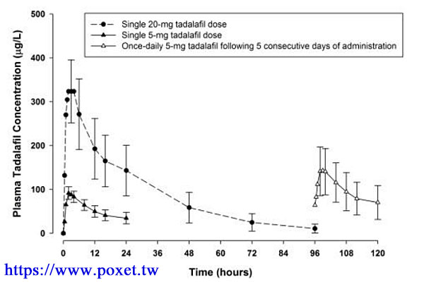 從下圖可見,單次口服給藥後,最大血漿濃度(Cmax)之時間在給藥後 30 分鐘至 6 小時間(中位數為 2 小時),所以tadalafil建議至少在事前30分鐘至2個小時服用。倘若每日服用5毫克,血中隨時保持在8毫克相對效益,節省等後藥效發揮的時間。另一方面,從副作用來看,服用劑量愈高,副作用發生比例愈高,所以一般建議從較低劑量補充為宜。